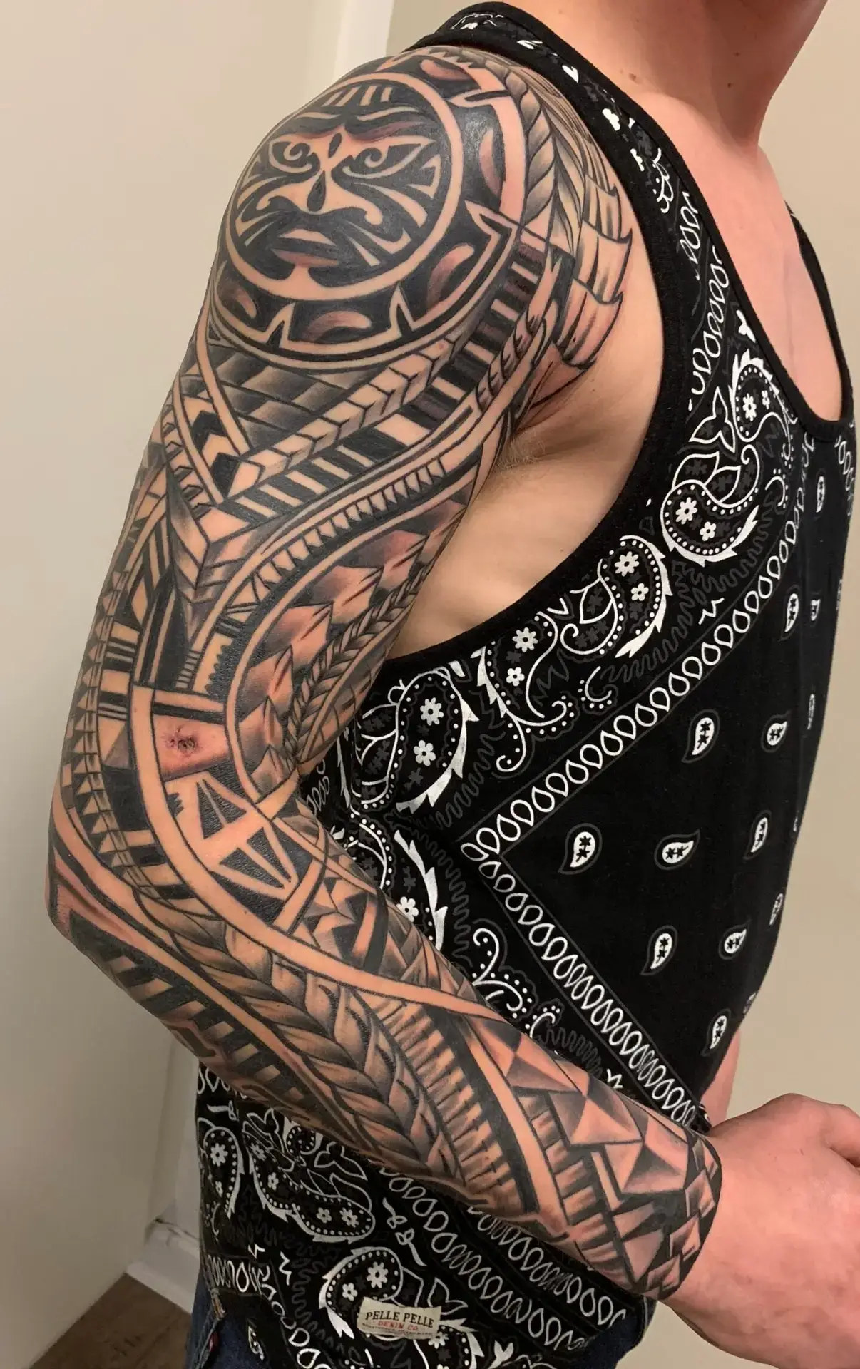 Denne tribal sleeve dækker hele armen med kraftige sorte linjer og symmetriske mønstre. Hver detalje er udført med præcision, så designet passer perfekt til kroppens anatomi. En kompromisløs og grafisk stærk tattoo, der kombinerer oldschool symbolik med moderne teknisk kontrol.fra Tattoo Mini