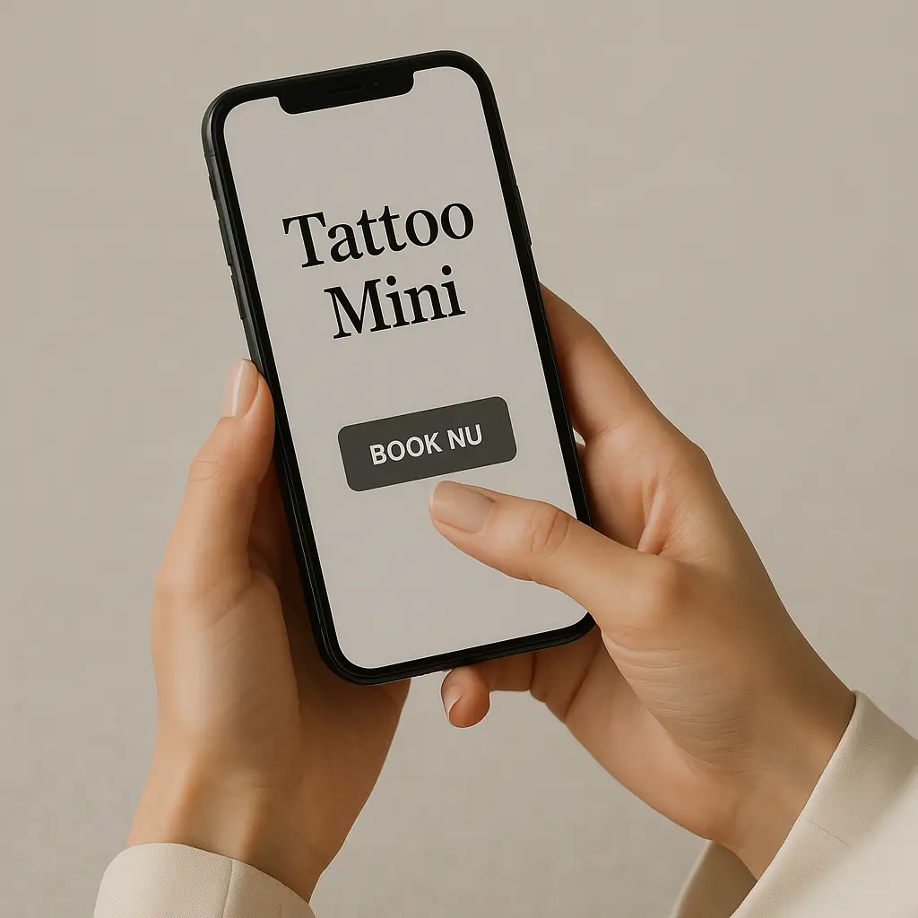 Billedet viser en kvinde, der booker tid til en tatovering hos Tattoo Mini direkte fra sin smartphone. Tattoo Mini tilbyder realistiske og unikke tatoveringer i Gentofte tæt på København, med fokus på kvalitet, tryghed og personlig stil. Book din tid nemt online.