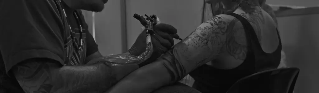 Tatovør København.Sort-hvidt billede af en professionel Tattoo Mini i gang med en detaljeret arm-tatovering. Billedet fremhæver både atmosfæren i studiet og det høje tekniske niveau i realistiske tatoveringer. Perfekt til dig, der ønsker kvalitet og erfaring frem for hurtige løsninger.